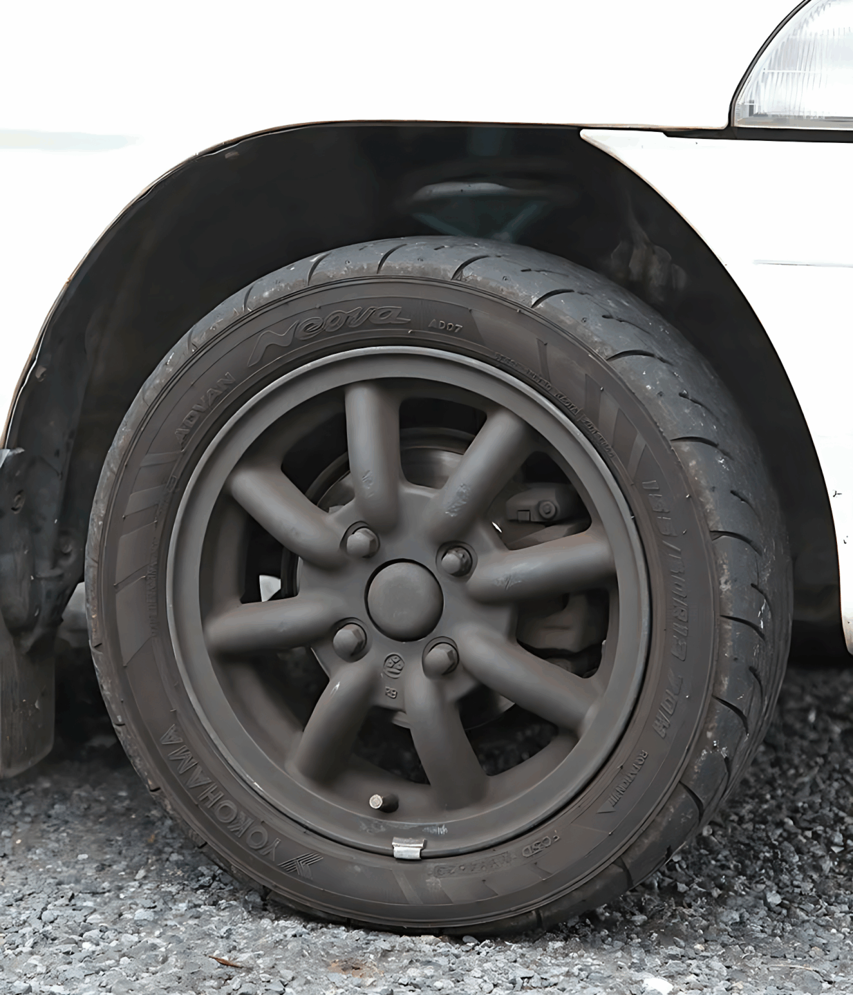 ホイールは受注品となる13インチのRSワタナベエイトスポーク。タイヤは165/60サイズのアドバンネオバAD07が組み合わされる。ホイールハウスの中にチラッと見えるのは水色のダンパーケースでお馴染みのKYBニューSRスペシャル。