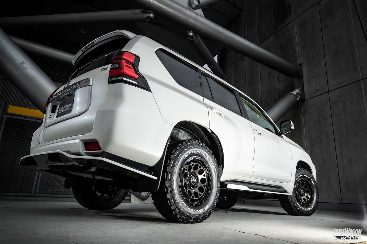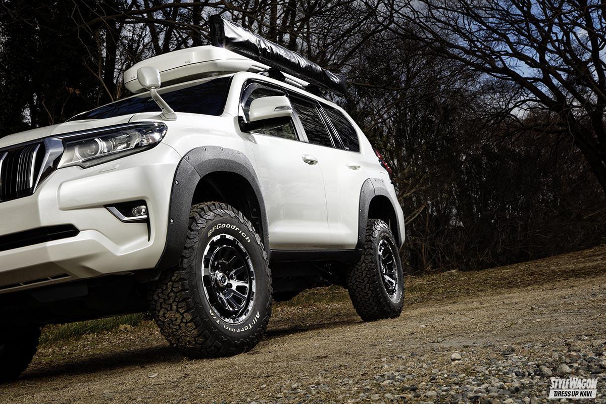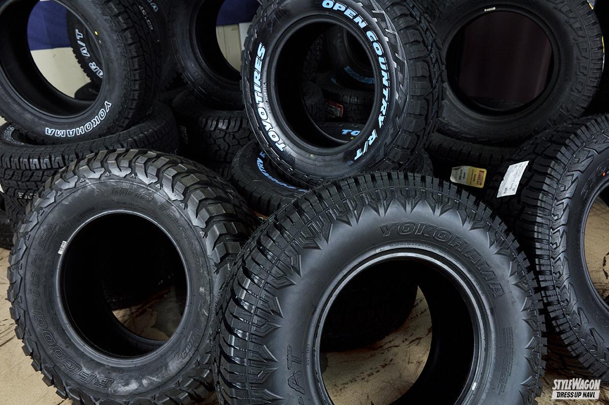 一般的なノーマルタイヤと違い、ゴツゴツしたブロックパターンが特徴のオフロード系タイヤ(以下、オフ系タイヤ)。昨今のカスタムシーンにおいて、アウトドアやキャンプブームの影響もあり、車高を上げてオフ系タイヤを履かせるスタイルの人気も高まっている。