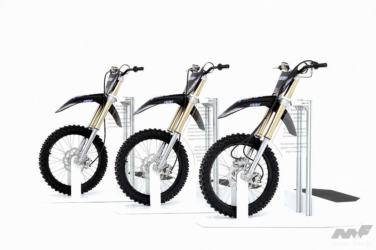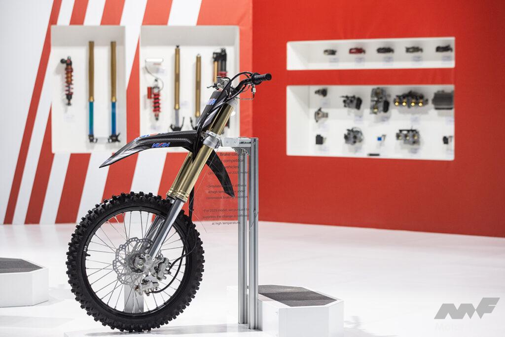 市販のオフロード競技車両に採用されているピンスライド式フロントブレーキキャリパーと、今後レースに投入予定の新型ブレーキキャリパーを体感型の展示として出展。
