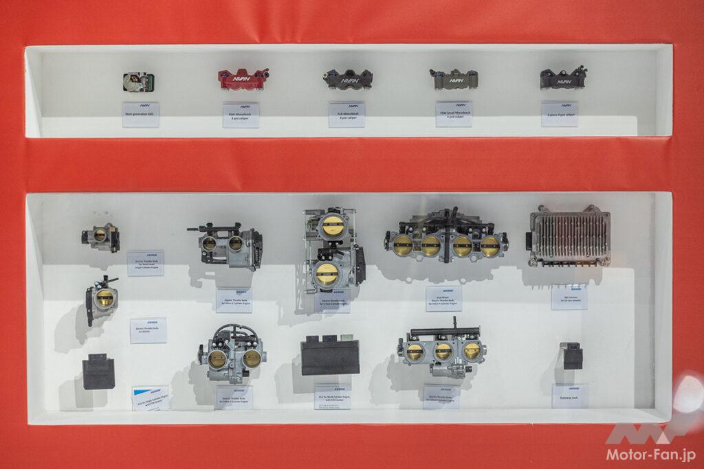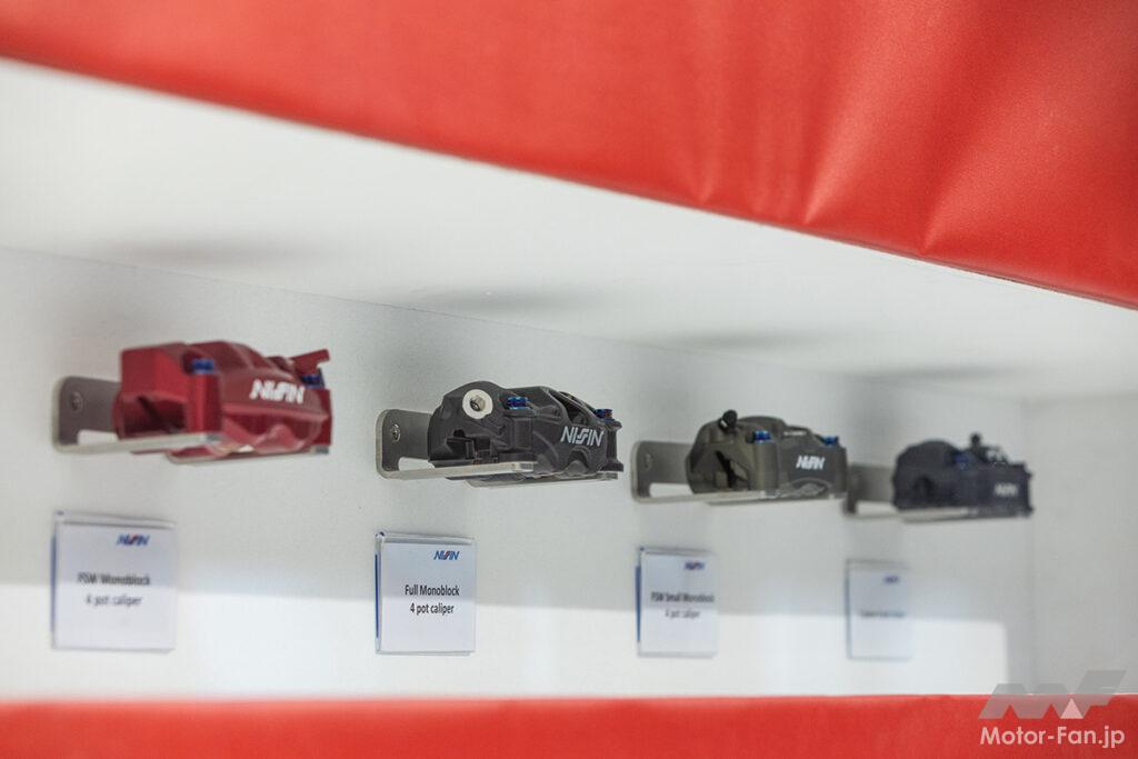 日立Astemoのブースには、NISSIN(ニッシン)のレース向け新型フロントブレーキキャリパーを展示。ラジアルマウント型で4ピストンを採用した新型フロントブレーキキャリパー最大の特徴は、約15%の軽量化を実現した軽量ボディ。軽さを追求しながらも高い剛性を維持し、制動力やコントロール性、高温時のレバー剛性変化抑制は、過去最高レベルを獲得している。