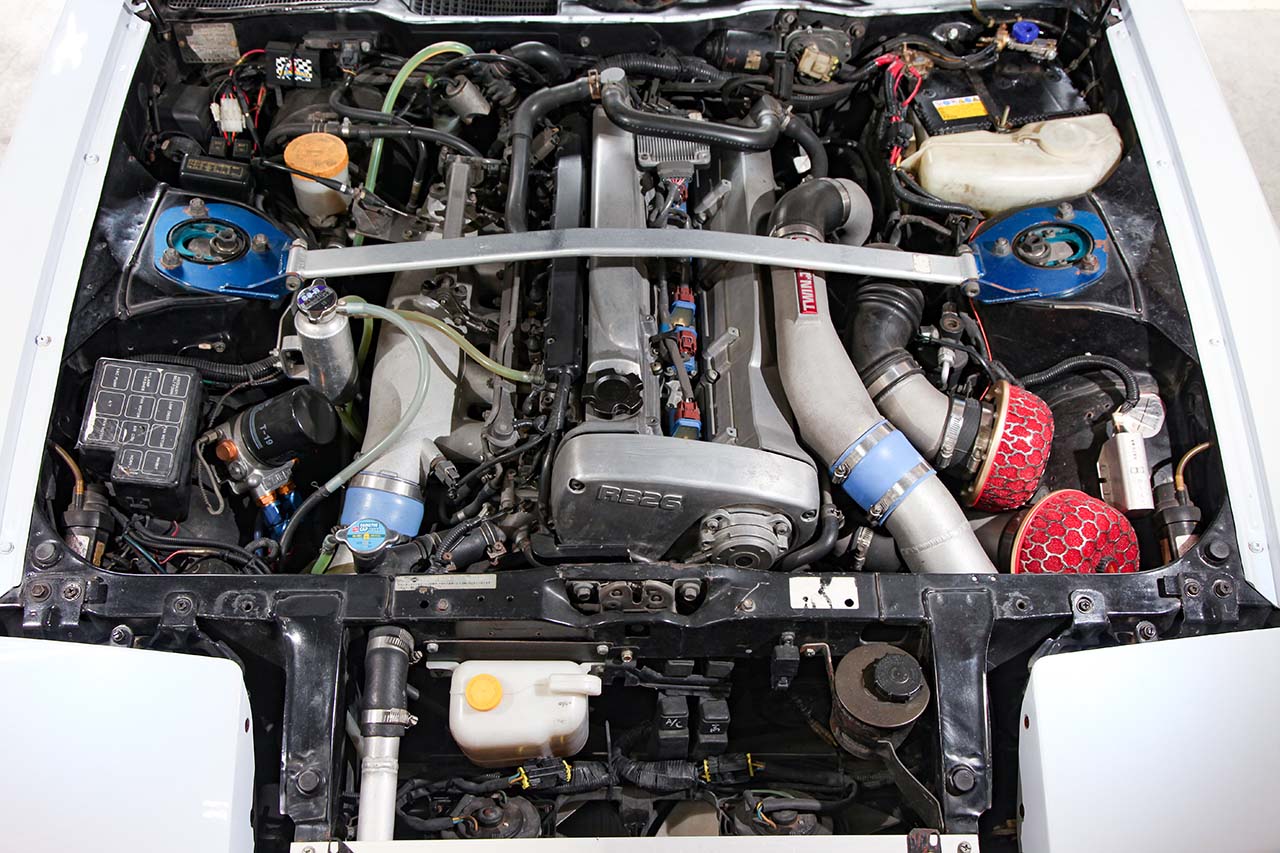 エンジンルームに収まるRB26DETTは基本ノーマル。エアクリーナーが交換され、前置きインタークーラーと岐阜のグローバルによるワンオフマフラーが導入される程度に留まる。
