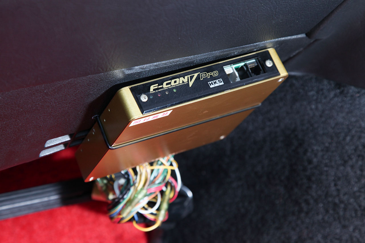 前置きインタークーラーはBNR32用を流用。「パイピングを取り回ししやすくするため、コアを上下逆さまにセットしているのがポイントですね」と藤田さん。エンジンの制御を行なうF-CON Vプロのセッティングは、藤田さんとの付き合いの長いグローバル永井さんが担当した。