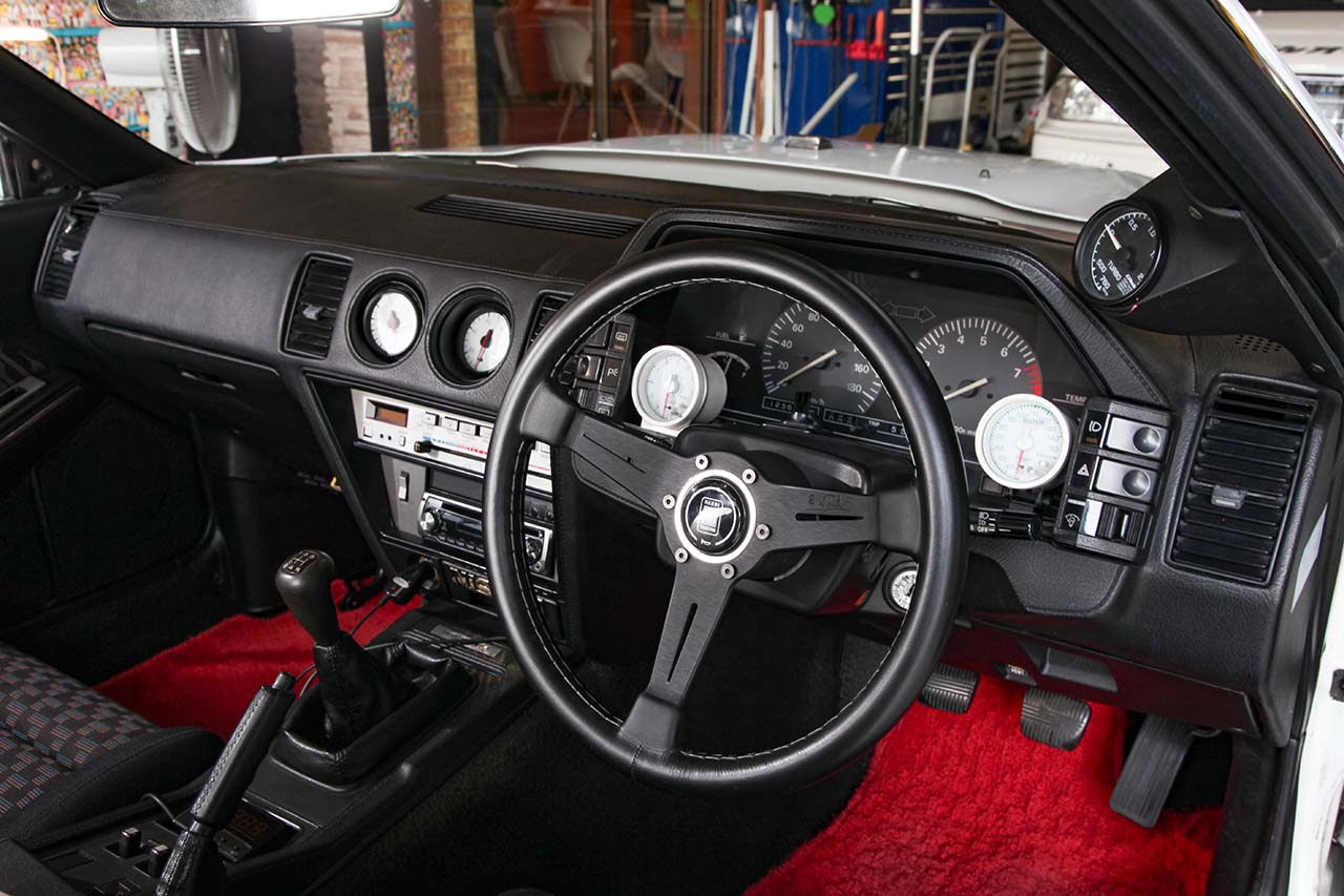 ステアリングホイールはナルディクラシックに交換されるけど、シフトノブは藤田さん拘りの純正。Aピラーのブースト計、メーターナセル左右の油温計と排気温計は、当時モノのトラストGReddy製がセットされる。