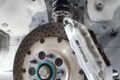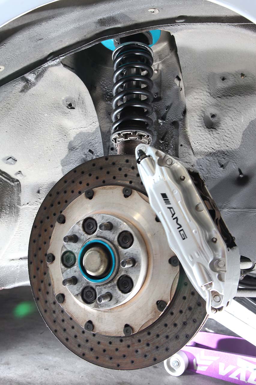ビルシュタイン車高調が組まれた足回りのセットアップは岐阜のノーティーベアーに依頼。フロントブレーキはブレンボ製F50キャリパーキットで強化される。藤田さんいわく、「本体シルバーでAMGのロゴが入っているのは、以前AMG E55で使われてたからなんです」とのこと。