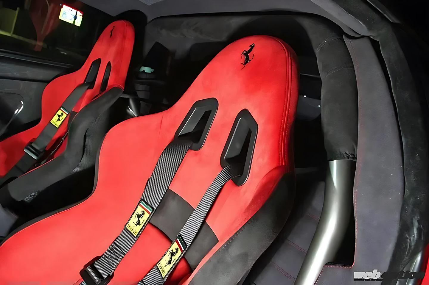 360モデナではオプション扱いだったカーボンシェルのセミバケットシートを標準装備。4点式ハーネスとともに“跳ね馬”があしらわれている。また、チャレンジストラダーレにオプション設定される4点式ロールバーも装着。重量増を最小限に抑えるため、なんとチタン製とされているのが驚きだ。