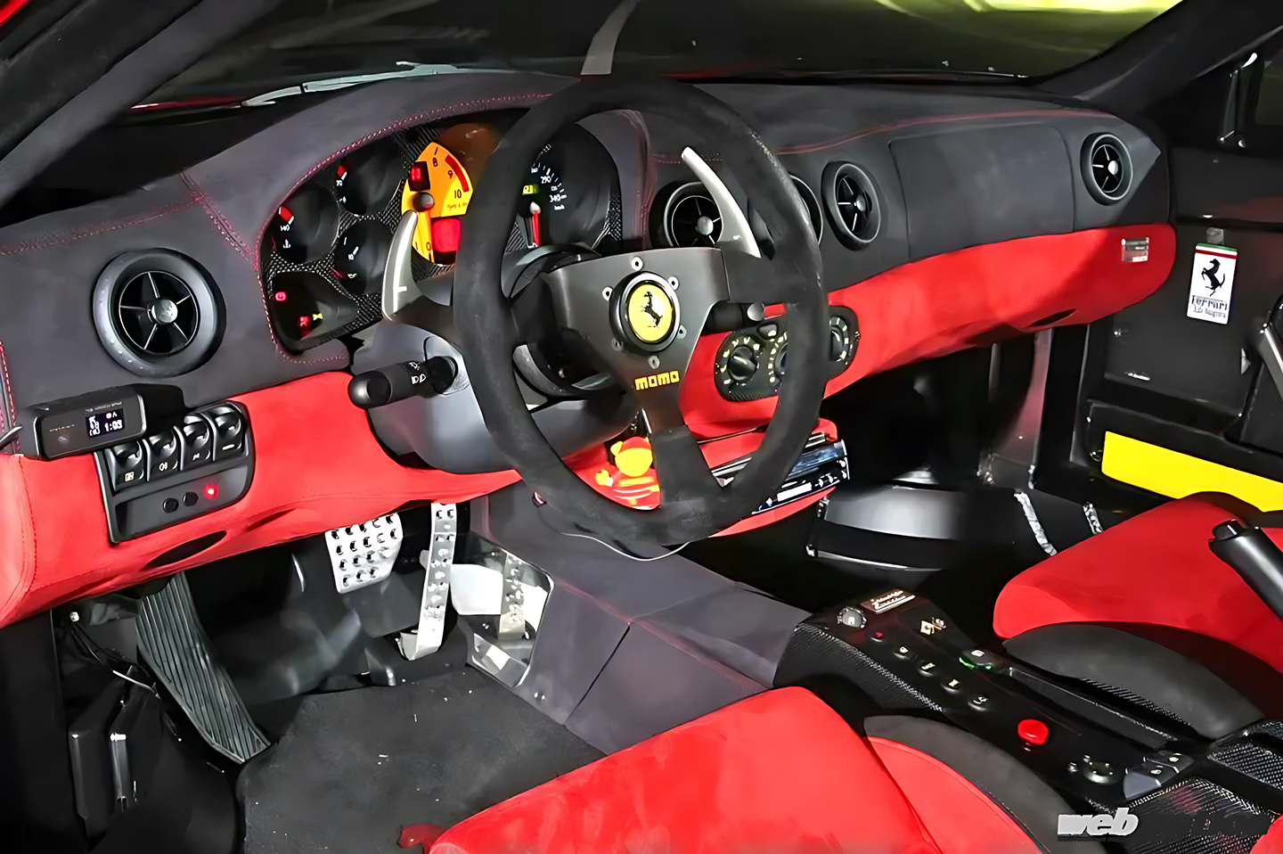 360モデナのメーカーチューンド仕様だが、注目すべきは軽量化で、ドアパネルやシートシェル、アンダーパネル、センターコンソールなど随所をカーボン化。さらに、リヤウインドウには航空機用の軽量素材レキザンを使うなど、ベースモデルより170kgも軽い1280kgを実現している。0-100キロ加速4.1秒、ゼロヨン13.9秒、最高速300キロがメーカー公表値だ。