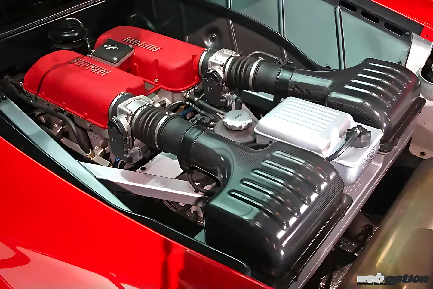 細部を見ていく。エンジンは、90度のバンク角を持つ3.6L V8のF131F型で、ベースモデルに対して25psアップとなる425psを8500rpmで発揮。カーボン製とされたエアインダクションボックスやエンジンルームサイドパネルなどは360チャレンジストラダーレ専用品となる。