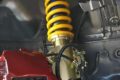サスペンションは、オーリンズFLAG-Lをベースに独自の減衰力セッティングを施したモンスターオリジナルを装着。AYCの制御に合わせてストロークさせる方向でセッティングを煮つめた逸品だ。