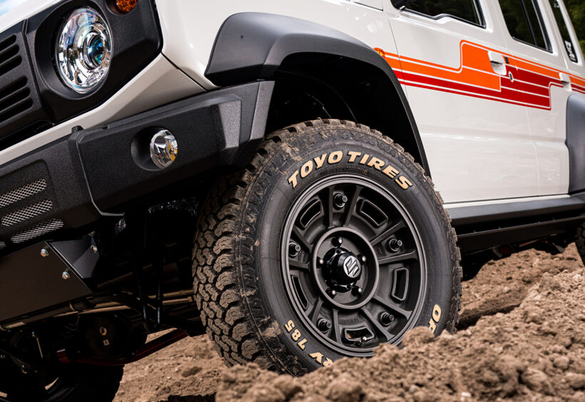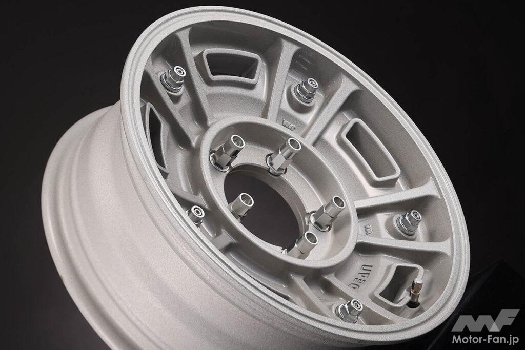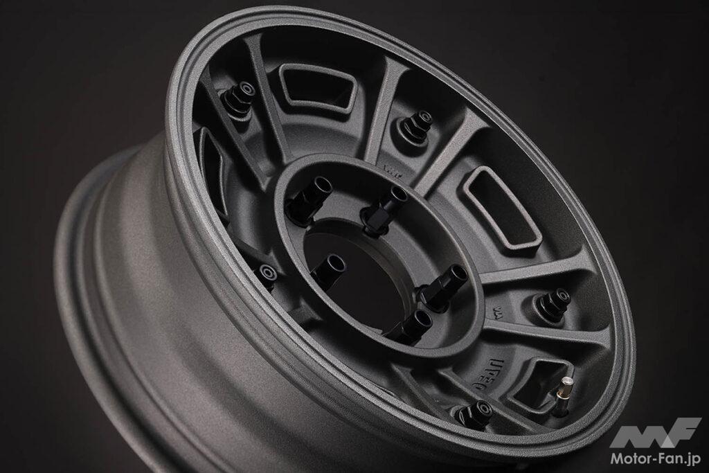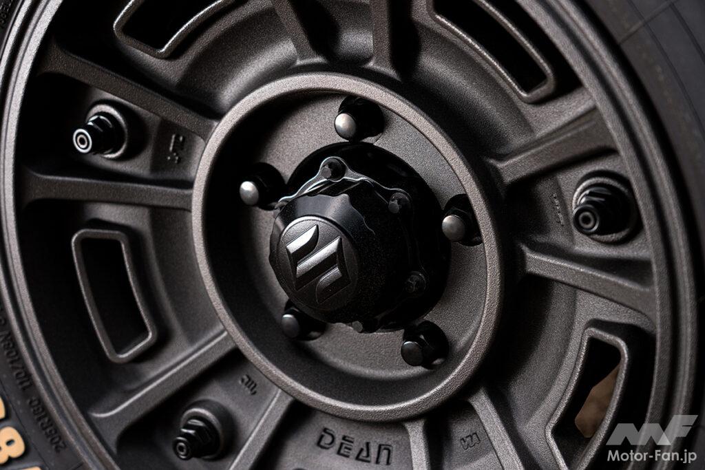 さらに注目は質感の表現だ。長年使い込んだホイールのような風合いを、ショットピーニング処理によって再現。ざらりとした風合いは1970年代のオフホイールを想起させる。“新品なのに使い込まれた表情”を持つユニークな存在であり、ジムニーの無骨さと見事に呼応する。