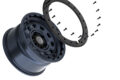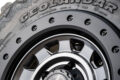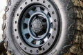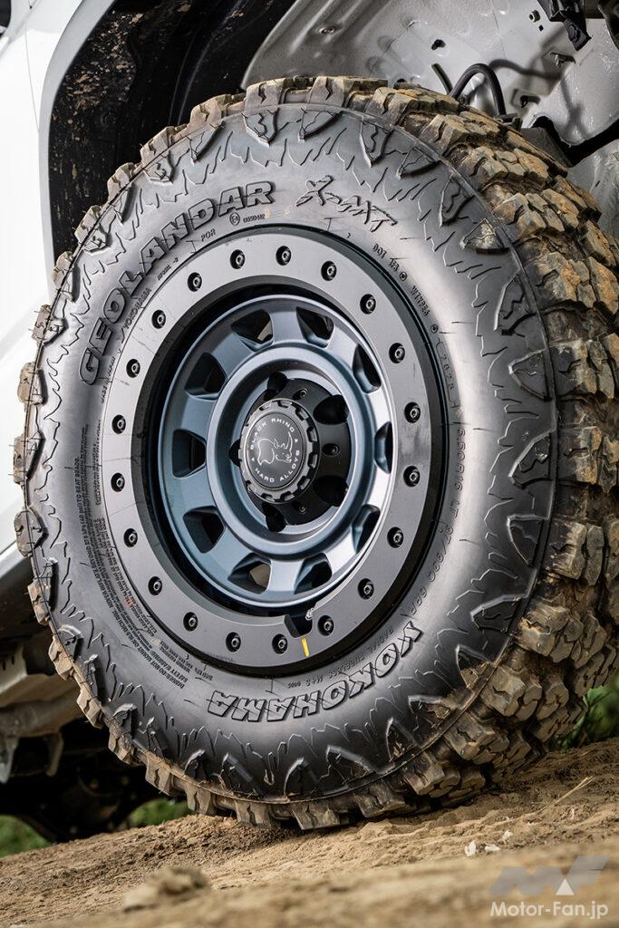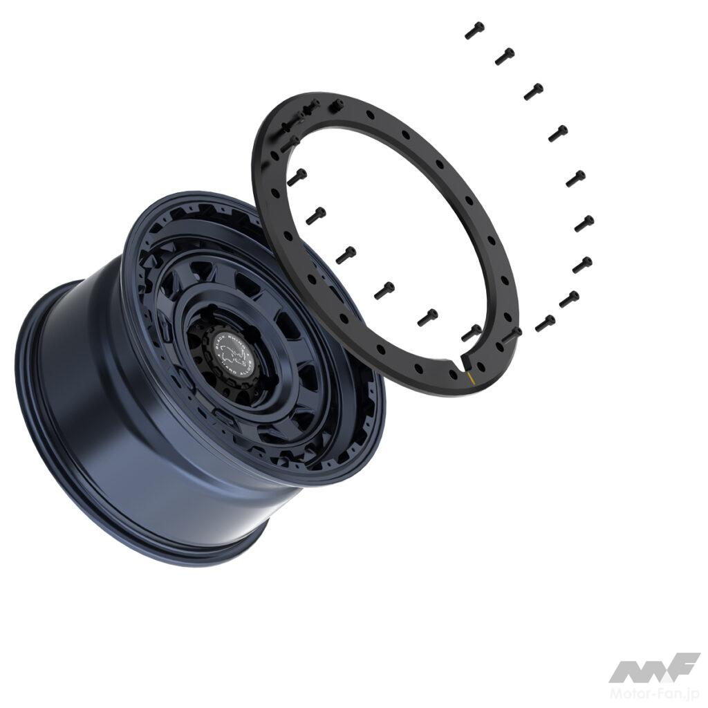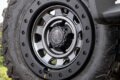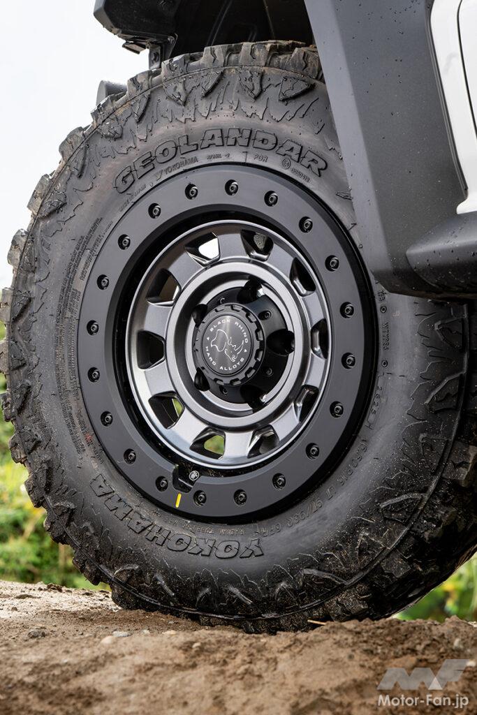 当モデルは、ロックガードリングが備わるのが最大の特徴。樹脂製の、やや厚みのあるリングがボルトで留まっているのだが、コレは石場等の悪路走行時にリムが傷つくのを防いでくれる。そしてこのリング、素材からもわかる通り別体式。それゆえ、よりリアルなビードロックスタイルになっていることも見逃せない。デザインはスチールホイールをも連想させる武骨さで、タイヤをひと際大きく見せるスタイルも相まって、足元からタフさ、ラギッドさを強調する。