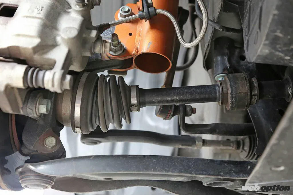 エンジンに合わせてミッションもマツダスピードアクセラの6速MTを搭載。搭載スペースを確保するためにフレームを大胆にカットし、ドライブシャフトはアクセラ純正を使うが、デミオのアウタージョイントに適合させるべくスプライン加工を施した。