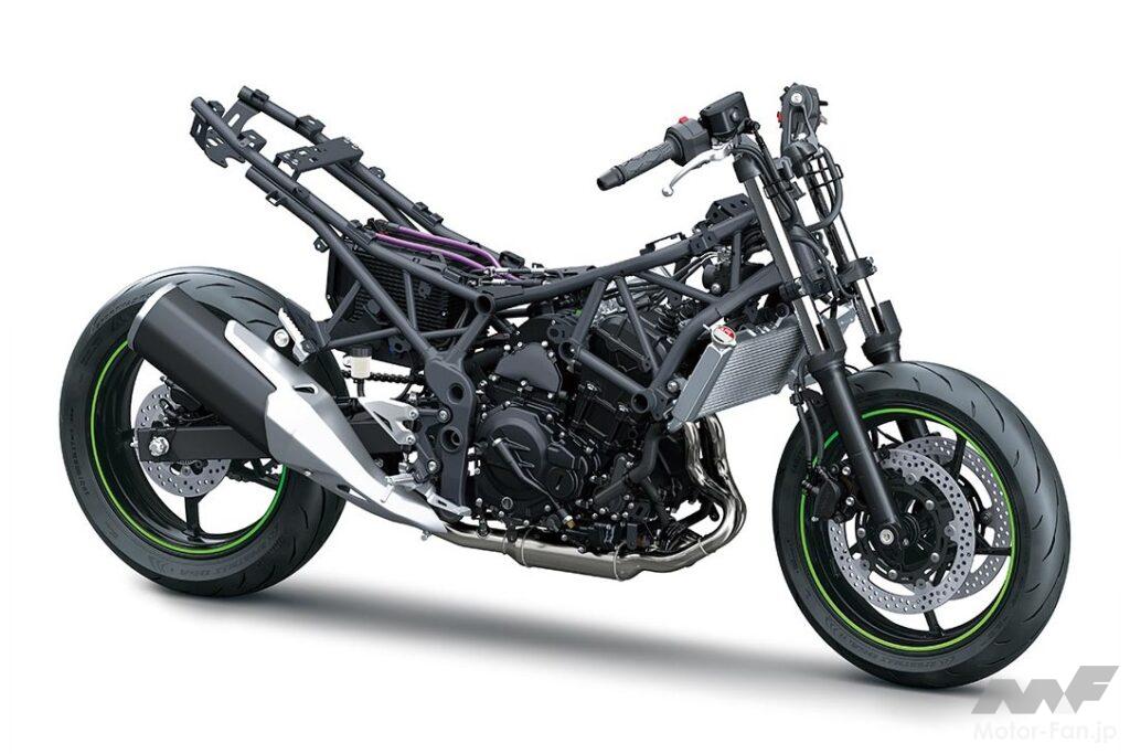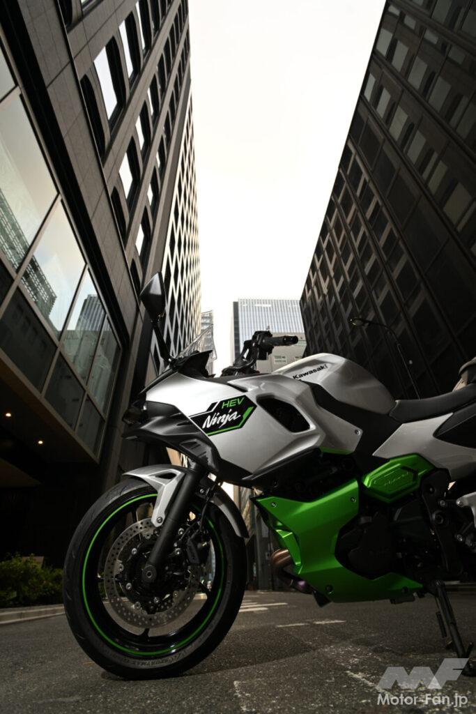 451ccのパラレルツインは輸出仕様のニンジャ/Z/エリミネーター500用がベースだが、動力の断続に加えて、エンジンとモーターが生み出すパワーの配分調整を行う電子制御式自動クラッチは専用設計で、トレリスフレームや外装は既存のニンジャ系とは似て非なるデザインを採用している。