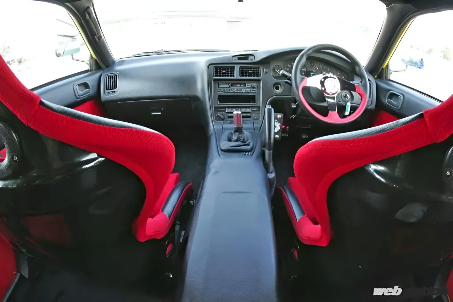 内装も凄まじい。シートにもフロント&リヤともにフルバケを装着。ドア内張りも作り直し、シートに合わせ赤×黒でコーディネートしてスポーティな仕上がりに。SW20は、元々ミッドシップということもありストレッチ化によるボディ&インテリア以外の大幅な加工はミッションシャフトの延長程度で済んだ。とはいえ、サイドブレーキのワイヤーやラジエターホースなども同様に延長している。