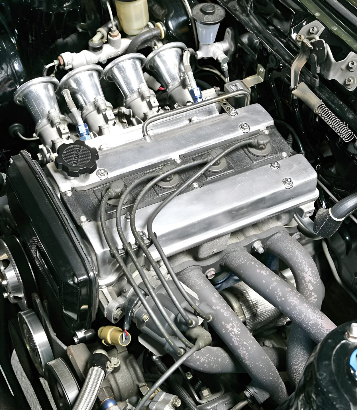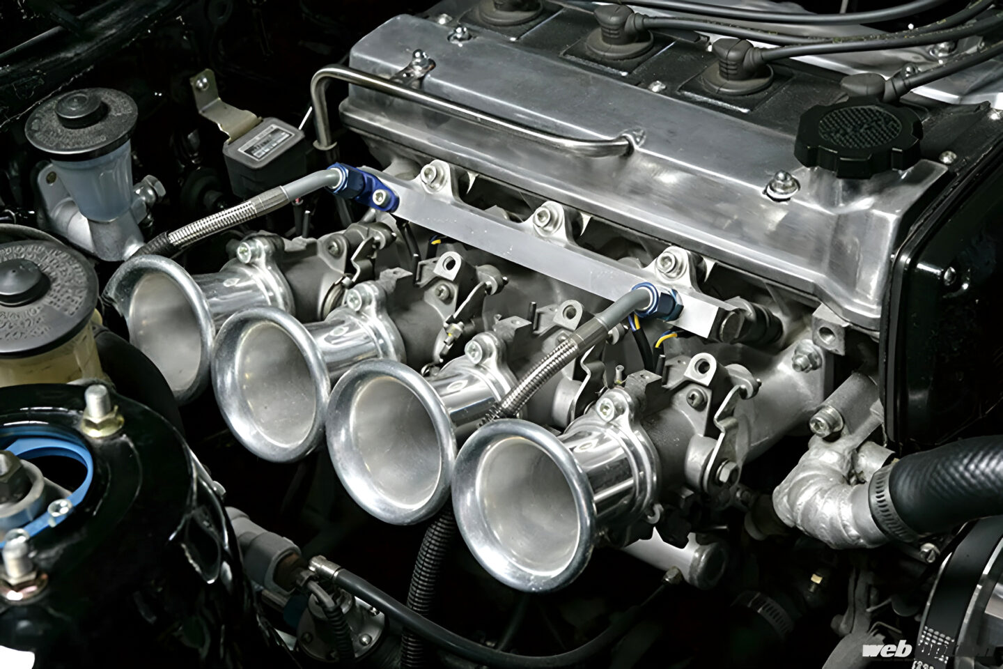スロットルはAE101の5バルブ4A-G用4連スロットルを装備。各部の磨きや配線&配管を隠すことによって、見た目もスッキリと仕上げている。