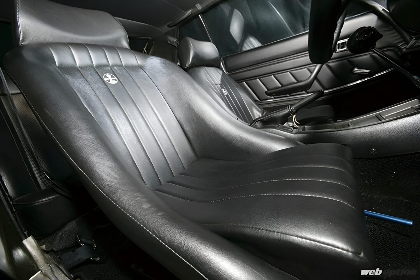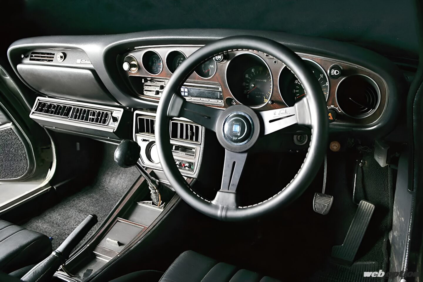 ノーマル然としたインテリアだが、シートはコブラのヘッドレスト付きバケットシートを2脚セット。定番のナルディクラシックステアリングも雰囲気作りに貢献している。クーラーはユニットこそ当時モノを使っているが、システムは一式AE86のものを流用している。