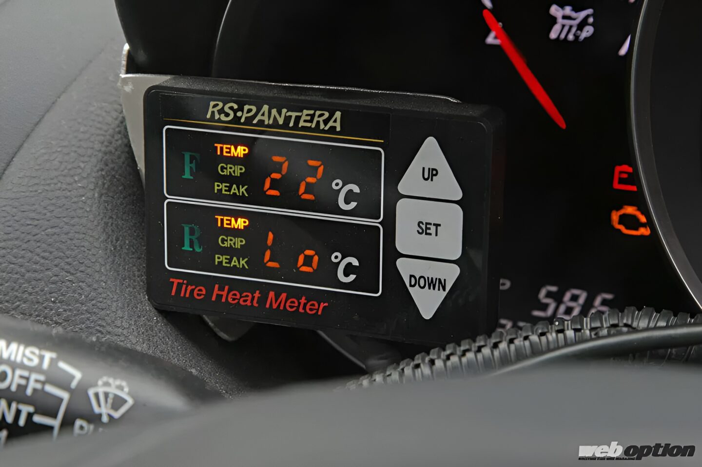 コラム奥にマウントされているメーターは、RSパンテーラオリジナルの“タイヤヒートメーター”。タイムアタックなど、タイヤの温度管理が重要なステージで役立つアイテムだ。