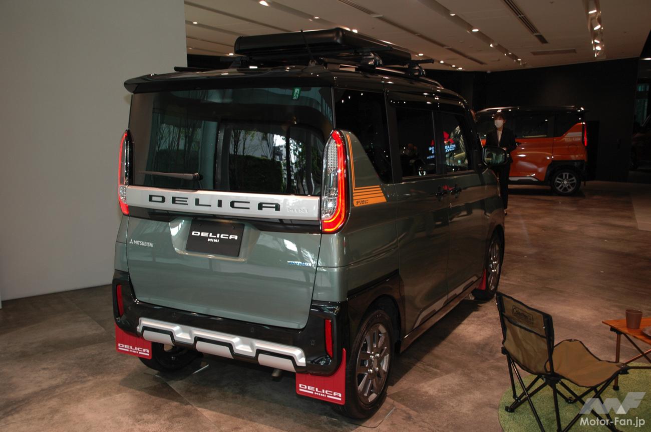 デリカミニに用意されているマッドフラップは見た目ばかりのファッションモノではなく、実用性も考えられている。特に泥除けの性能、デリカらしいヘビーデューティさを演出するためにはある程度の長さが必要だが、長すぎると駐車時に輪止めとタイヤの間に挟まって最悪の場合はバンパーを落としてしまうことになる。また、通常であればホイールハウスの内側の後方に設置するが、デリカミニではサイズ的にやはり前述のトラブルに繋がりかねない。