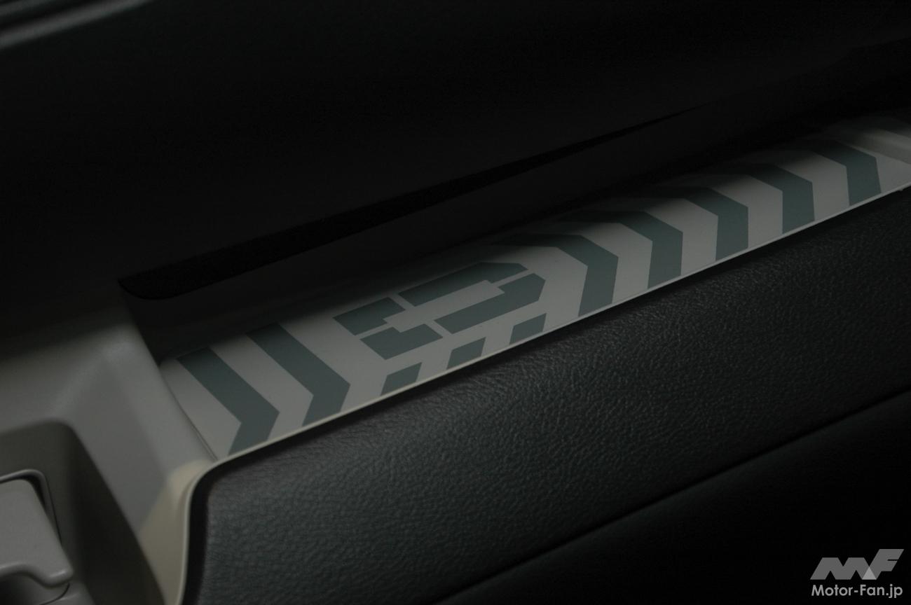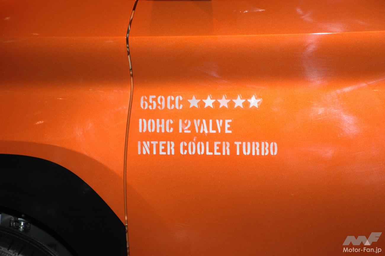 フロントドアに貼られているのが排気量や環境性能の★印などのエンジンの仕様を表したもので、用品担当曰く「昔よく貼られていたDOHCやTURBOなどのステッカーをオマージュし、ステンシル書体でスタイリッシュに演出した」とのこと。