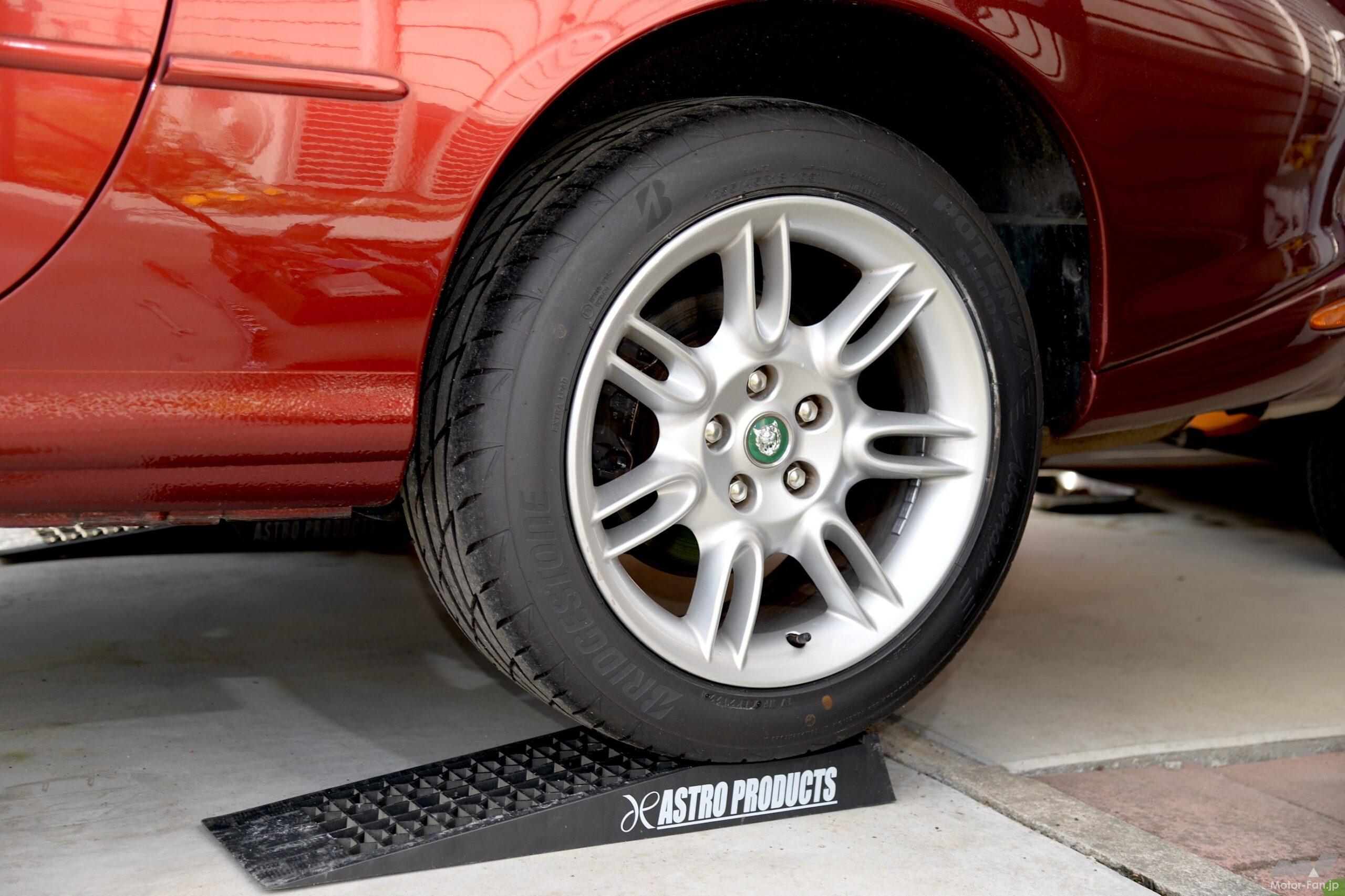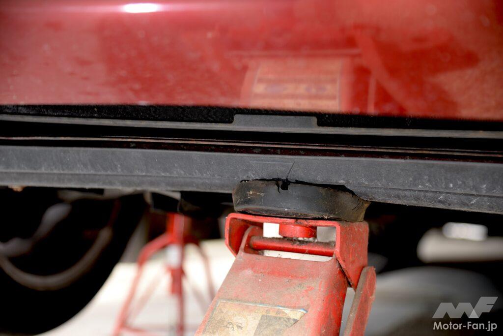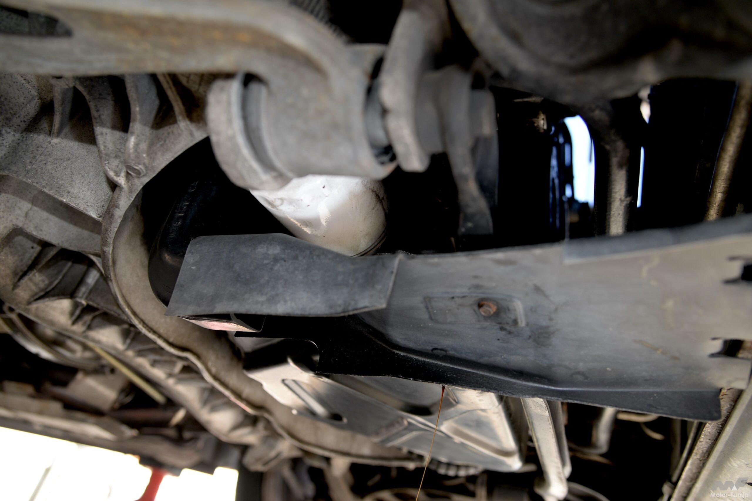 それが上写真の場所で、よく見れば三角マークがある。ここへジャッキを当てて持ち上げ、サイドシルにある純正ジャッキを当てる場所へウマを入れる。リヤタイヤをラダーに乗せているのは車体前後ができるだけ水平になってほしいから。このラダーは直前までの愛車をローダウンしていたために揃えたもの。本来は必要ない。