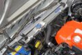 EXマニはアルテッツァ用をそのまま使い、マフラーはノーマル風に仕上げられている。エンジンルームの各部や補機類はブラックアウト、ヘッドカバーもオレンジにペイントするなど、見た目の美しさにも拘りを見せる。