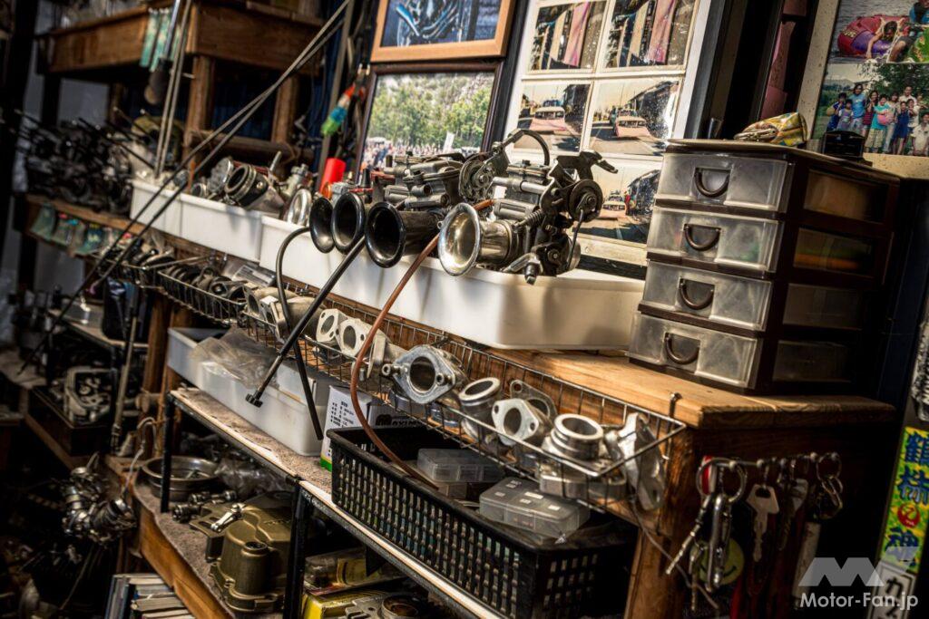 それが今から7年前のこと。4MINIマニアとしては意外にも最近からのことで、長澤さんは現在56歳だから40代後半から始めたことになる。だが、タイミングとしては良かったのだろう。息子さんたちも仕事に就き育児にお金がかからなくなる時期だから、お小遣いは好きなように使える。すると4MINIたちがどんどん増殖していった。と同時にカスタム熱もどんどん上がり、横型エンジンを何機も組んできた。限界を試したくてハードチューンを施すと当然ながらブローすることもある。そんなわけでエンジンが車体以上に増えていった。