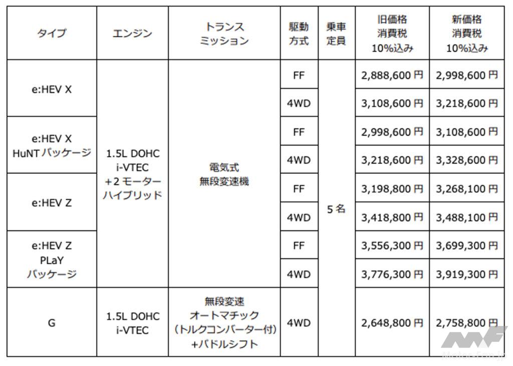 今回の一部改良では、「G」「e:HEV X」「e:HEV X HuNTパッケージ」に、Honda CONNECTディスプレー、ワイヤレス充電器、ETC2.0車載器をセットでメーカーオプションとして追加設定し、ニーズに対応した。