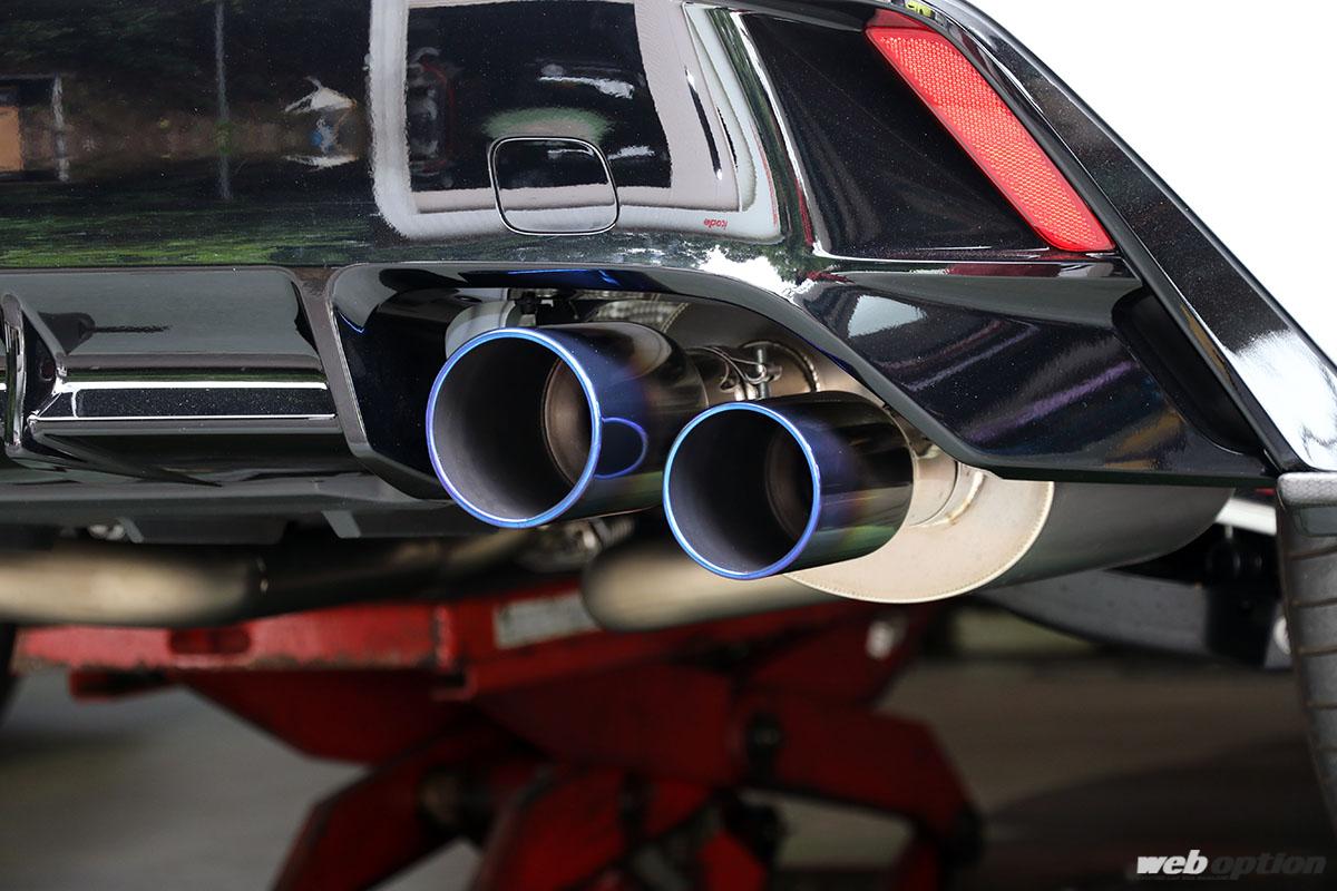 このエキゾーストマフラーは、センターパイプ以降から置き換えるタイプ。チタンマテリアルならではの乾いた高周波サウンドは絶品で、虹色に輝くヒートグラデーション仕上げのテールエンドと合わせてIS500にさらなる特別感を与えてくれる。