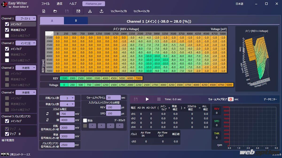 プロチューナーやエキスパートユーザー向けには、専用のイージーライターももちろん用意。エンジン回転や車速、スロットル開度などに応じた3D補正マップによるきめ細かなブースト制御が可能となる。