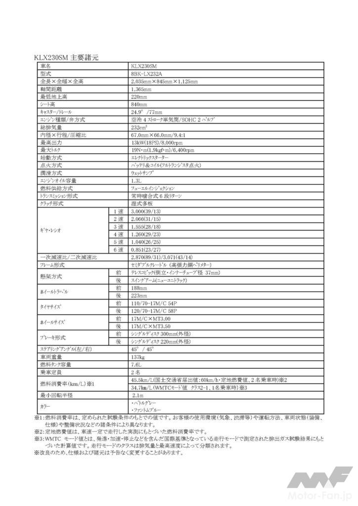 カワサキモータースジャパンは、新型「KLX230SM」を1月13日に発売した。価格は税込61万6000円。カラーは「バトルグレー」と「ファントムブルー」の2色を用意した。