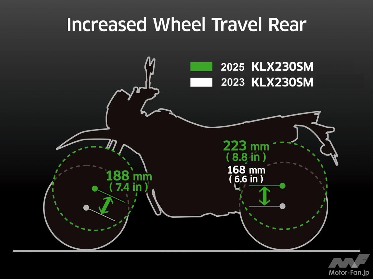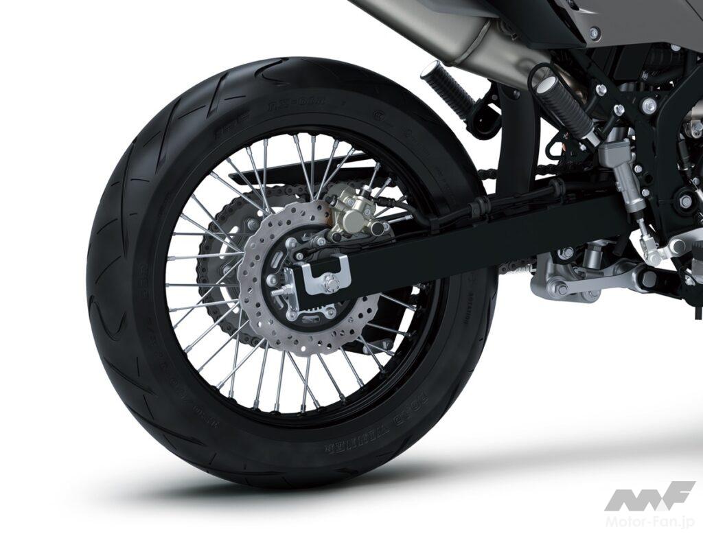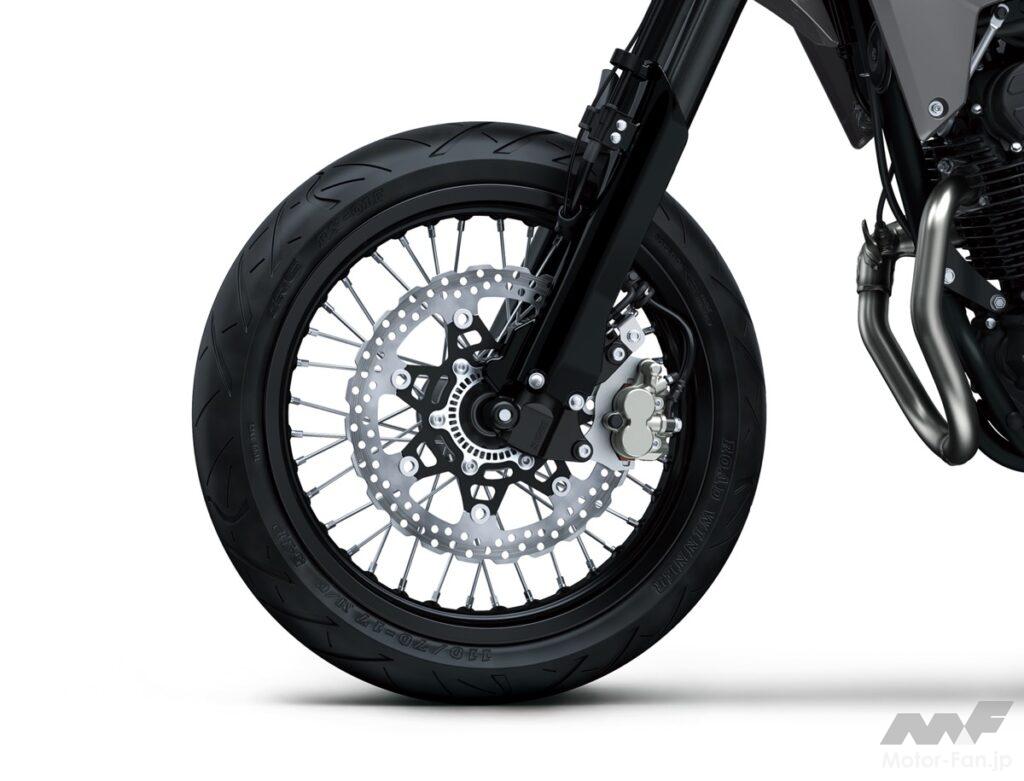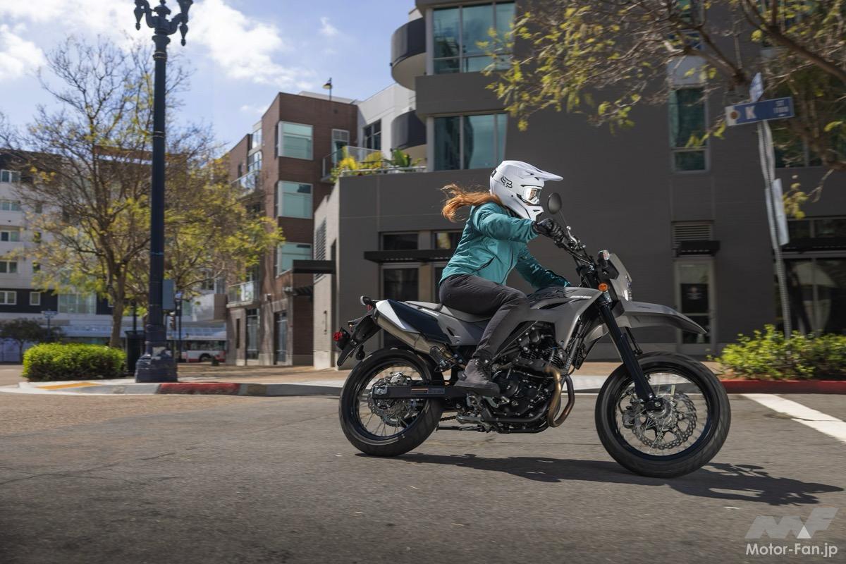 開発にあたっては、カワサキの最新のモトクロッサー「KX」をフィードバックし、コンペティションモデルに劣らないアグレッシブなスタイルを実現した。