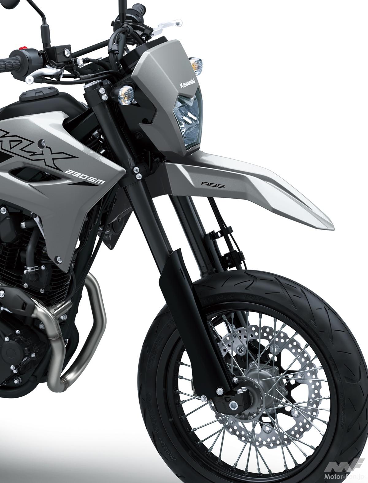 「KLX230SM」は、新型となったオフロードモデル「KLXシリーズ」の中のひとつのモデルで、オーフロードモデルをベースにストリートに対応させたモタードとなっている。