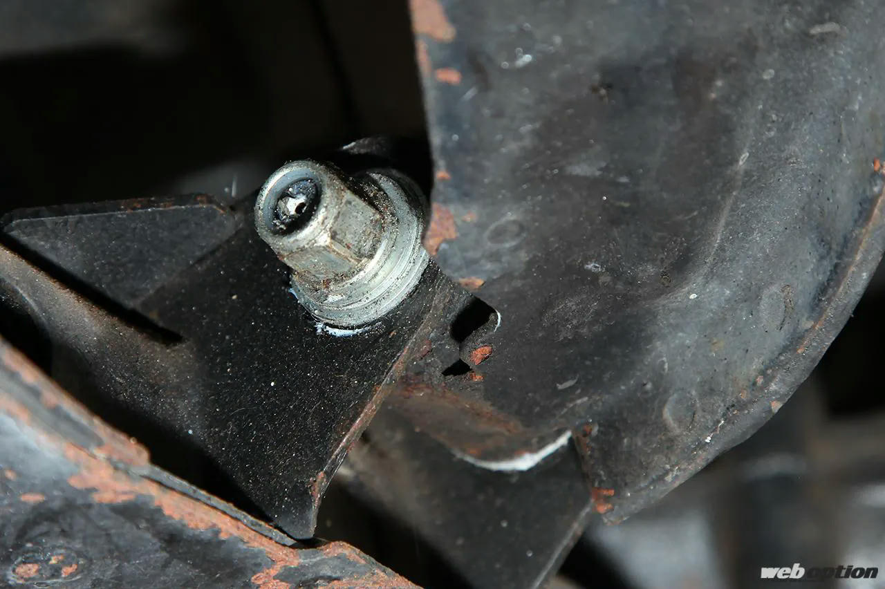 リヤサスメンバーは20mmほど取り付け位置を上げてリジッドマウント。それでも車高ダウン量に対するドライブシャフトの上向き角と、サスストローク時のキャンバー&トー変化が大きいため、細部の手直しが図られる。また、前後ブレーキキャリパーはS13ターボ(S14/15NA)用を装着し、それに伴ってリヤサイドブレーキ用ワイヤーの取り回しも変更される。