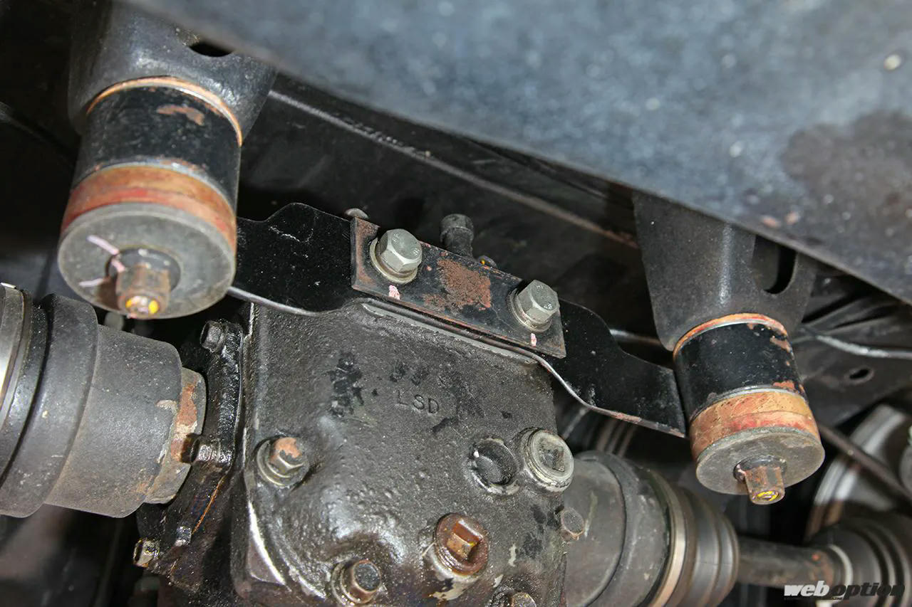 ドライブシャフトの上向き角を抑えるため、取り付け位置が16~17mm高められたデフキャリア。後ろ側は純正ブラケットを加工し、サブフレームに固定される前側はワッシャーと強度の高いロングボルトの組み合わせで嵩上げされる。