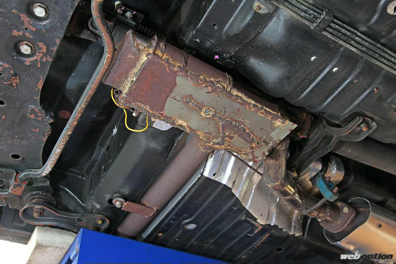 エンジンに合わせて搭載位置が変更されたミッション。加工マウントにシム(プレート)を組み合わせることで高さを合わせ、プロペラシャフトに負担が掛からないように調整される。