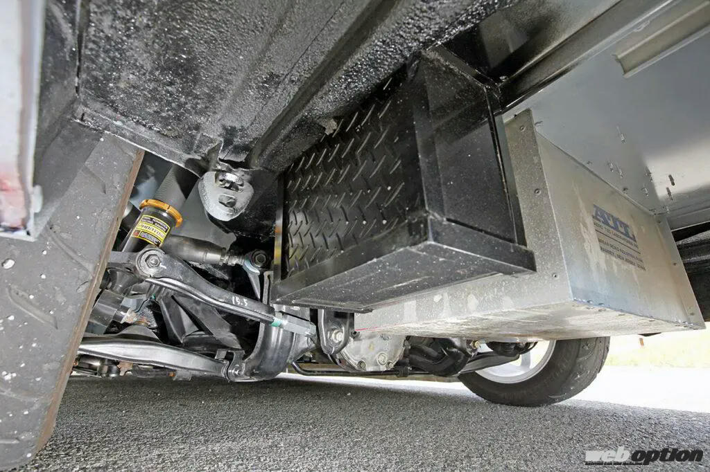 そこでこの車両は、モノコックを加工して前後にS14シルビアの足回りを完全移植。リヤサスのマルチリンク化を敢行したのだ。なお、ブレーキはフロントにR33スカイライン純正をインストールしている。
