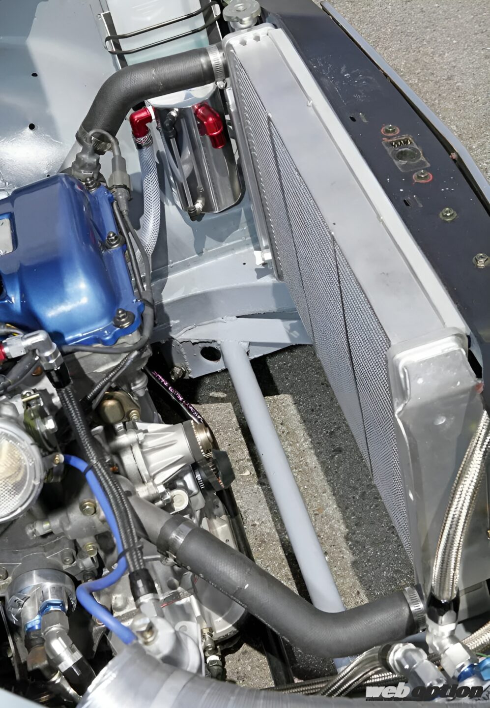 大型のラジエターはサイドフロー式の3層アルミタイプ。その真下に確認できるバーは剛性アップを目的としたもので、テンションロッドの付け根にダイレクトで接続される。