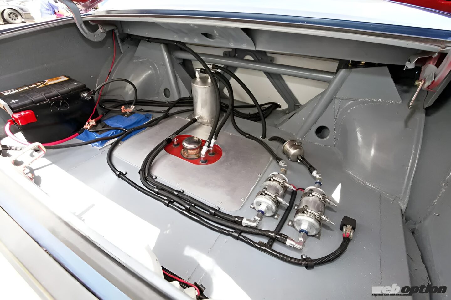 トランクスペースにはレース用のATL安全タンクを埋め込み、その周囲にコレクタータンクや燃料ポンプを美しくレイアウトしている。