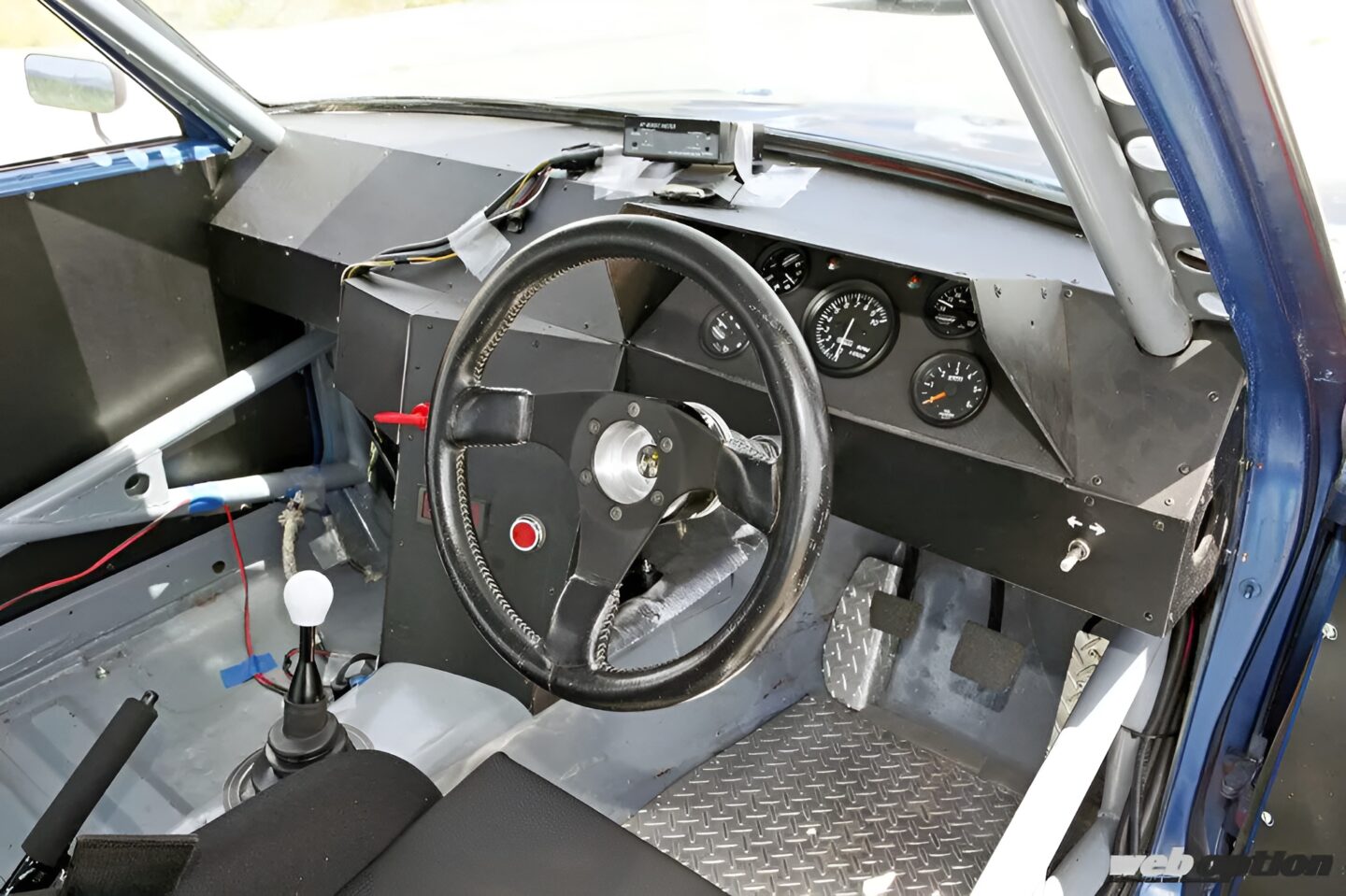 サイドバーやガゼットなど、当時は使われていなかった手法で剛性アップされているのが分かるインテリア。ワンオフダッシュボードには必要最低限のメーターを配置し、その仕上がりはレーシーそのものだ。
