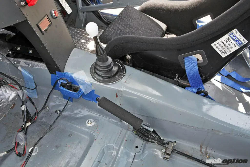 ミッションはOS技研の3速クロス。センタートンネルを含め、ボディ各部はシルビア用などのパーツ移植のため大きく加工されている。