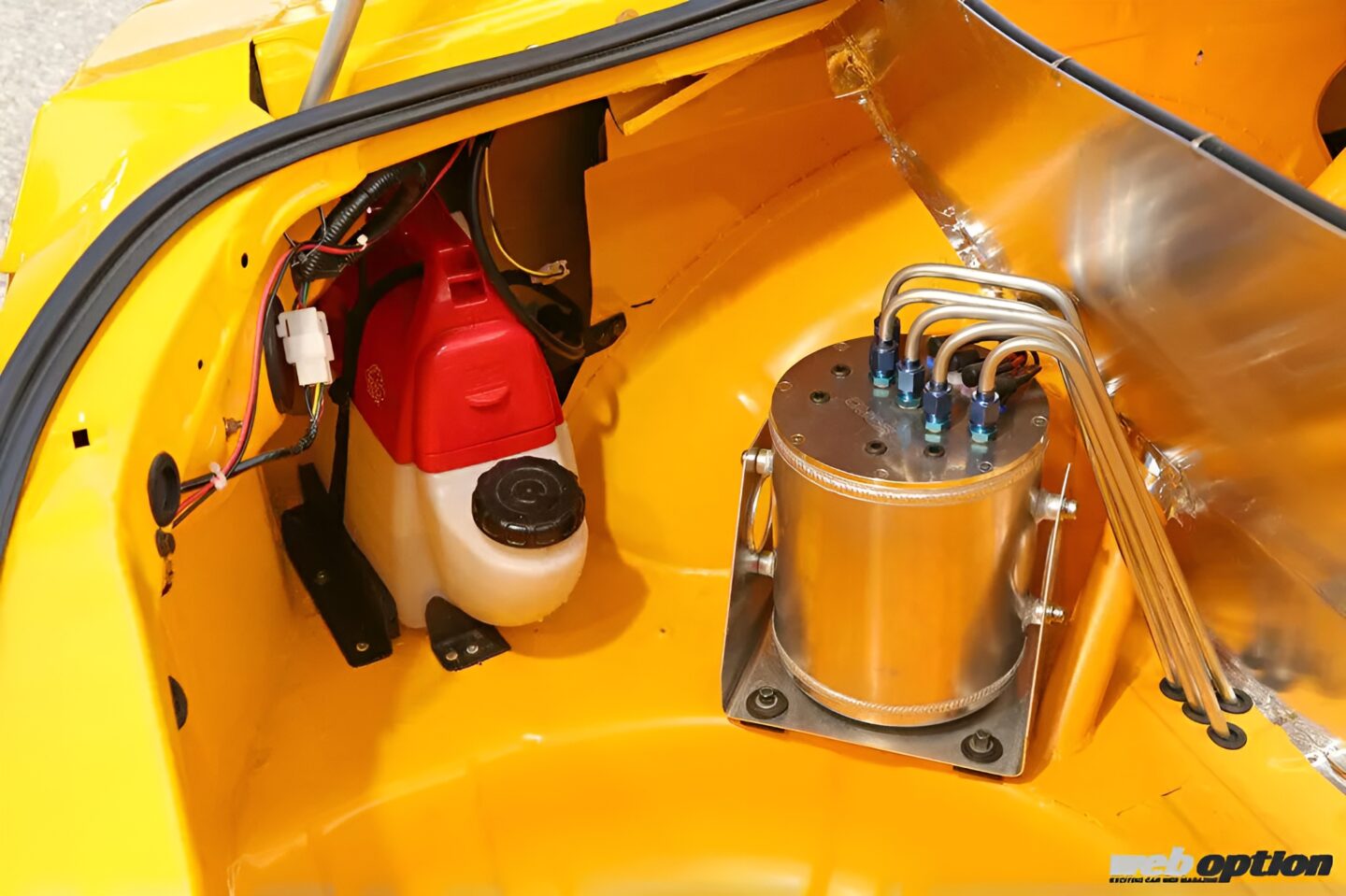 トランクルームには燃料の空打ちを防止するために、サードのコレクタータンクを設置。耐久性を配慮しつつ、美しさにも拘った造作がポイントだ。