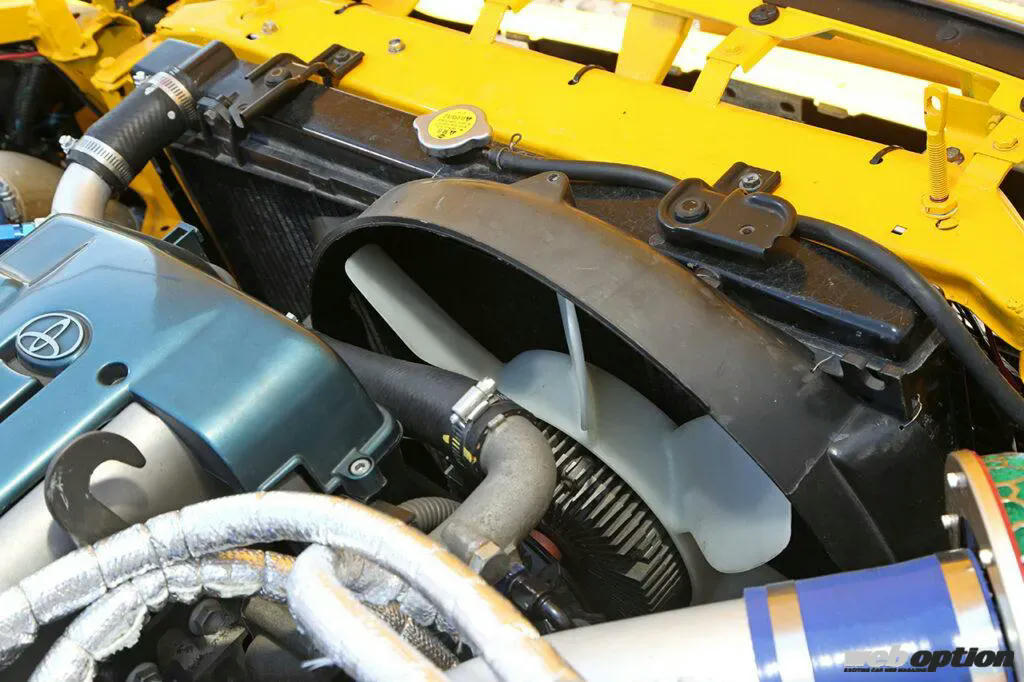 ドリフト走行会でクーリングを入れずに走り切れるよう、冷却系には注意を払う。エンジンスワップを行なっているにも関わらず、180SX純正ファンシュラウドを使用しているのは今井代表の拘りだ。大容量ラジエターやオイルクーラーの導入はもちろん、ウォータースプレーも装備する。