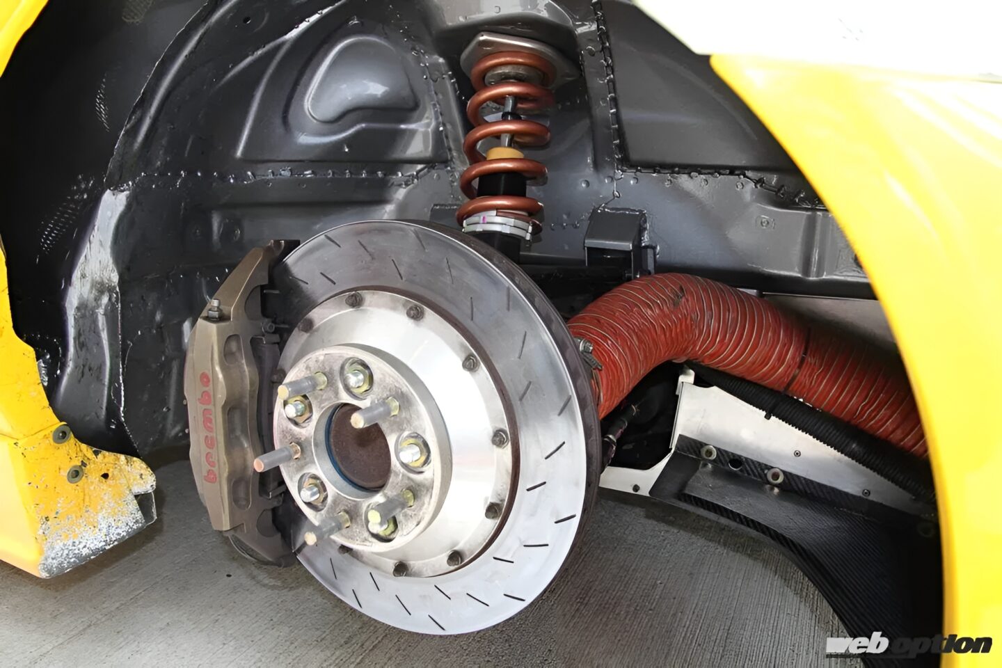 ブレーキは前後ともレーシングブレンボとし、スタビやアライメントなどの調整要素はしっかりと扱いやすいように作り込まれたサスペンション。車高調は、ザックスベースのオリジナルスペックを奢る。
