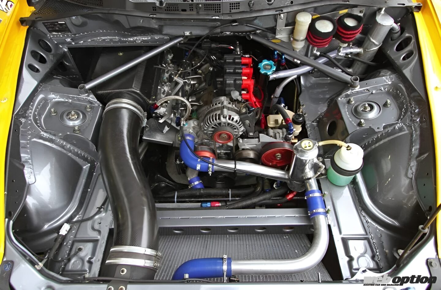 エンジン本体はFC3S輸出用の高圧縮(9.7)ローターや3分割のアペックスシールをインストール。ペリフェラルポート化されたインテークには、ワンオフのインマニを介して海外製の45φスロットルが装着され、ドライカーボン製のインダクションボックスで吸気効率を引き上げている。