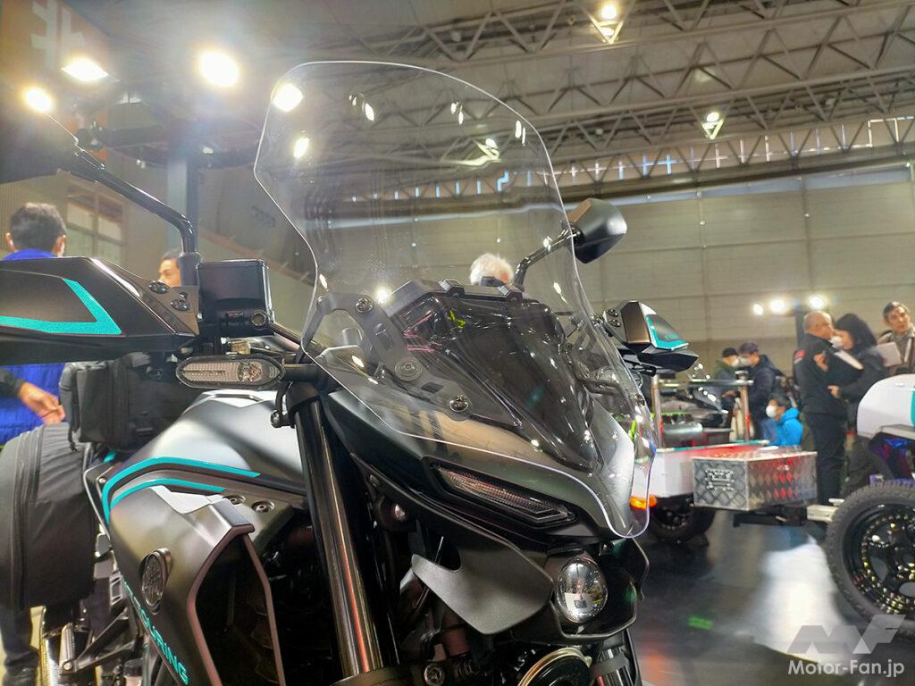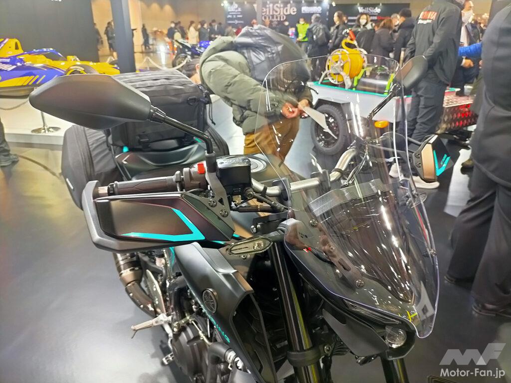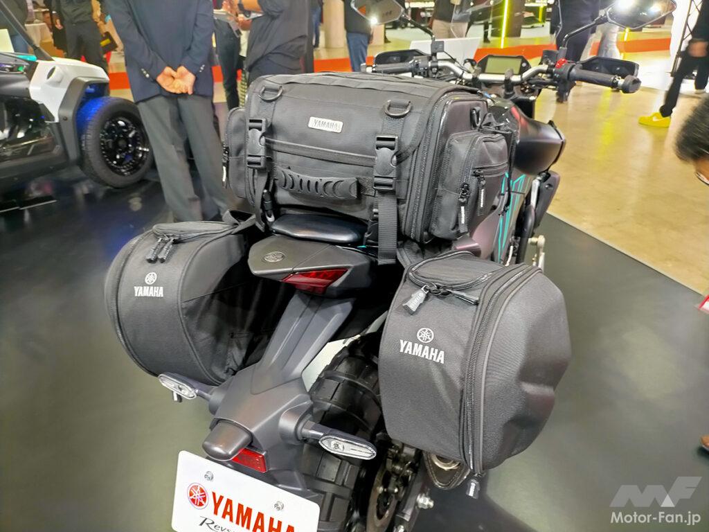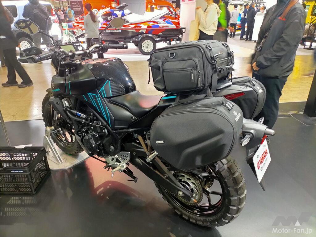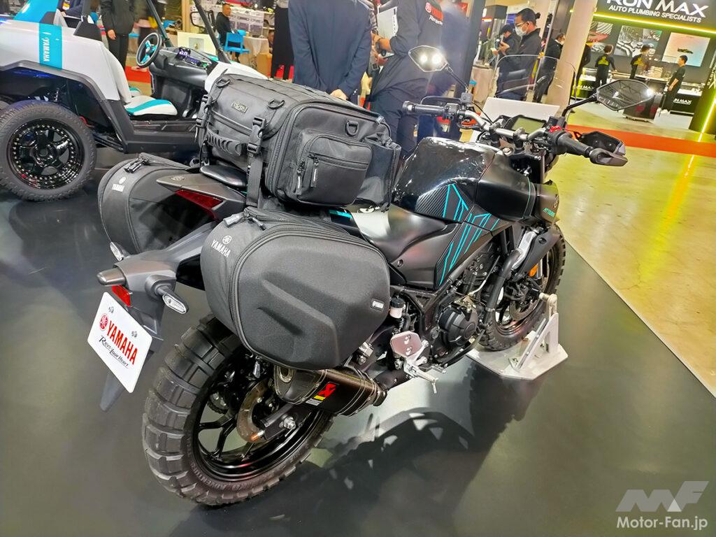 写真は東京オートサロン2025のヤマハブースに展示された、ワイズギアの最新アクセサリーを装着したMT-03 ABS(参考出品)。大容量のバッグ類を装着するなど、キャンプやアウトドアも楽しめるツーリングスタイルにアレンジされている。