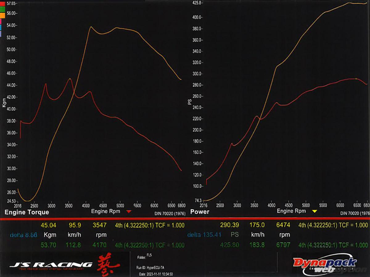 ジェイズレーシングのダイナパックテスト(係数ゼロ)では、フルノーマル状態(290ps)から約135psの出力上昇(425ps)を確認。サーキット走行時に常用する、3500~7000rpm域の大きく盛り上がったパワーカーブも見逃せない。