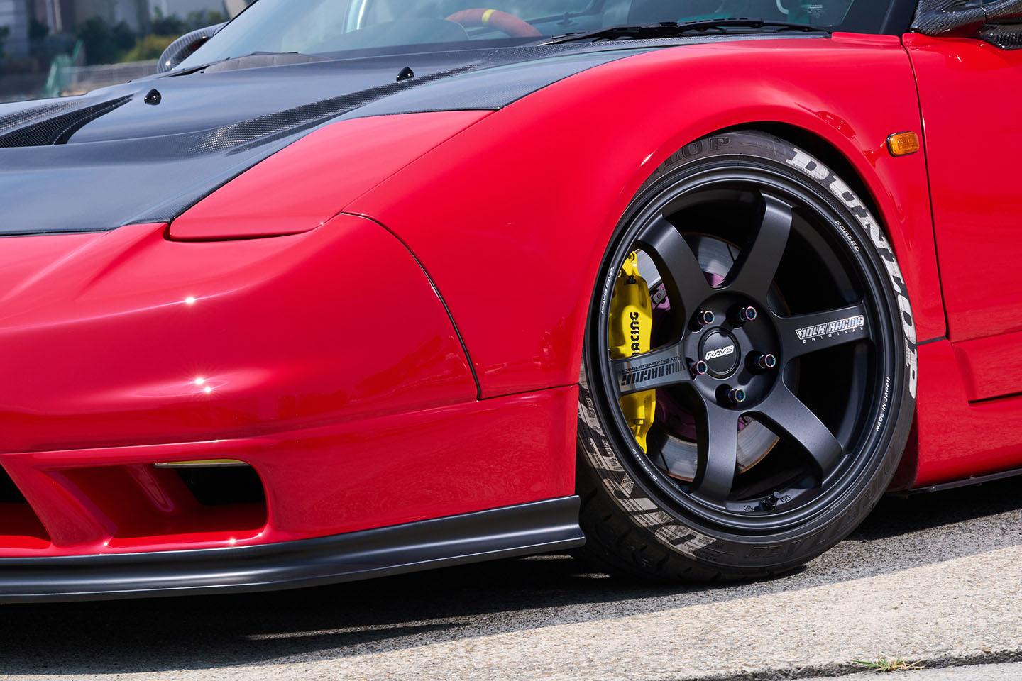 NA2純正デザインのフロントバンパーをNA1のリトラヘッドに合わせて加工装着。つい先日までは大型カナードも備えたGT寄りのスタイルだったが、ドライカーボン製ボンネットの投入に合わせてナロースタイルを突き詰めた。