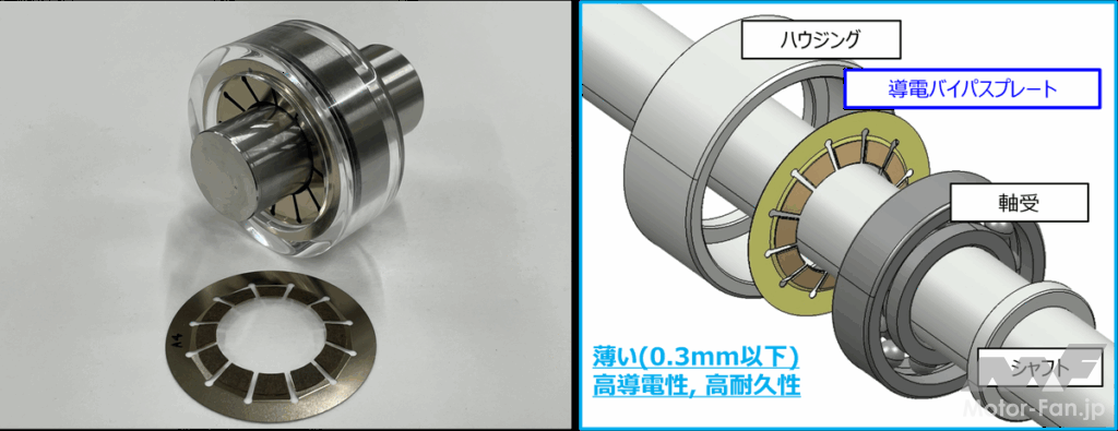 耐電食/EMC対策の導電アイテムは省スペース、導電性、耐久性が求められており、本製品はスプリング反力を活用した製品構造と独自開発した導電ペーパーを採用することにより、軸方向の追加スペース0.3mm以下で、軸受をバイパスする導電構造が実現された。モータ軸に搭載可能なサイズで、油潤滑下での高い導電性と耐久性を発揮し、耐電食/EMC対策に貢献する。2026年の早い時期に市場投入が開始される予定。