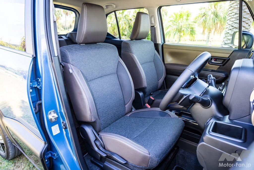 シートにはヘリンボーン柄の織物表皮を採用。あえて横向きに張り込むことで、室内のワイド感を強調しつつ、絶妙なメランジ感で程良い抜き感を演出したのがこだわりだ。また、アップグレードパッケージ装着車では、シートのボルスター部とドアアームレストに新規のブラウン合成皮革を採用する。