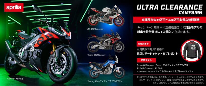 「ULTRA CLEARANCE CAMPAIGN」は、アプリリアの正規販売店で対象モデルの新車を成約した場合、通常の希望小売価格より大幅に値引きされた特別価格で購入できるキャンペーンである。値引き額はモデルによって異なるが、最大で44万円もお得になる車両も用意されている。