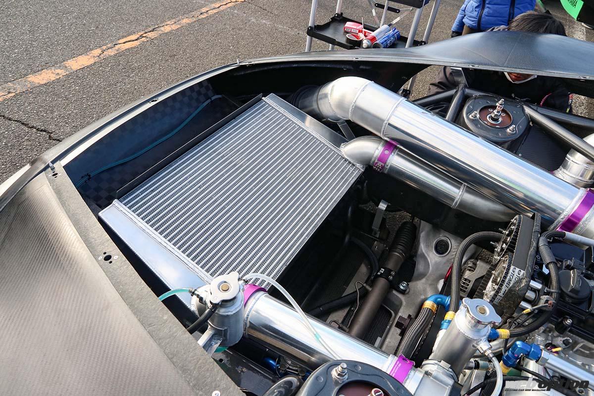 冷却系のレイアウトも見どころだ。前のマシンではリヤラジエターとしていたが、重量配分の改善で冷却系パーツを全てフロントに設置。車体上部側からインタークーラー、ラジエター、エンジンオイルクーラーを水平でマウントしている。